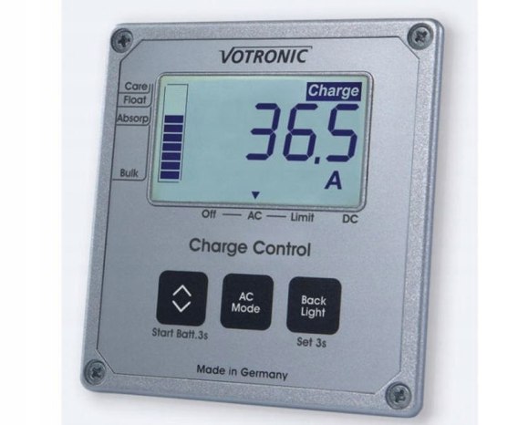 Panel kontrolny ładowania LCD S VBCS Triple znanej marki Votronic. Przydatne urządzenie monitorujące i sterujące do ładowarek serii VBCS Triple przeznaczone do przyczep kempingowych, kamperów. Panel sterowania wskazuje aktualny poziom źródeł ładowania, aktualną fazę ładowania, napięcie akumulatorów pokładowych i rozruchowych, a także aktualny prąd ładowania. Specjalna funkcja zabezpieczająca zapewnia ponowne włączenie przypadkowo wyłączonego ładowania sieciowego, jeśli akumulator pokładowy jest zagrożony głębokim rozładowaniem.