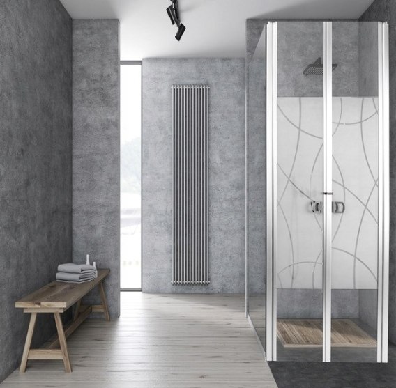 Eleganckie drzwi prysznicowe z dwoma obrotowymi panelami. Anodowany profil aluminiowy z przezroczystymi panelami ze szkła akrylowego. Panele połączone są mocnym paskiem magnetycznym. Panele posiadają nadruk cyfrowy na wysokości około 80 cm.